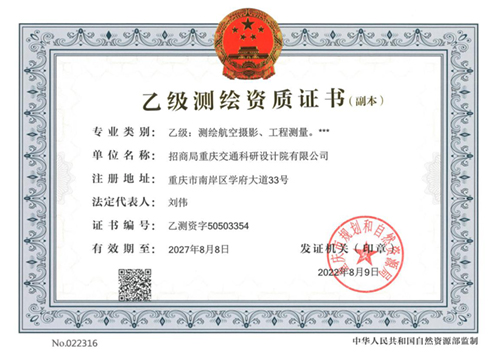 近日,重慶市規(guī)劃和自然資源局向招商交科頒發(fā)了測繪資質(zhì)(航空攝影、工程測量)乙級(jí)證書,有效期至2027年8月8日。2022年4月公司開展資質(zhì)需求調(diào)研時(shí),市場經(jīng)營部、重慶區(qū)域中心、道路研究院、第二勘察設(shè)計(jì)