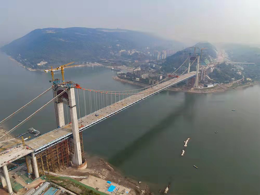 2022年3月15日,隨著最后一段鋼桁梁成功起吊,由招商交科主持設(shè)計(jì)的國(guó)內(nèi)最大跨度公軌兩用懸索橋——重慶郭家沱長(zhǎng)江大橋順利實(shí)現(xiàn)合龍,標(biāo)志著大橋主體施工全部完成。大橋的索纜制造及上部安裝工作由招商交科下