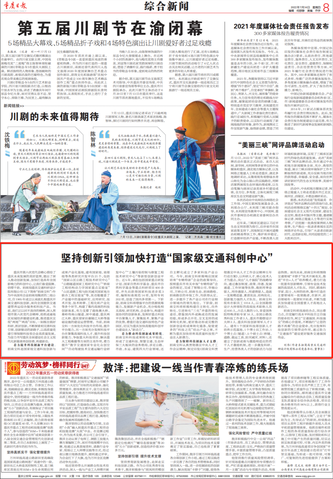 【編者按】7月14日,重慶日?qǐng)?bào)刊發(fā)招商交科黨委書記、董事長(zhǎng)劉偉《堅(jiān)持創(chuàng)新引領(lǐng)加快打造“國(guó)家級(jí)交通科創(chuàng)中心》署名文章,體現(xiàn)了招商交科立足交通科技型企業(yè),深入貫徹落實(shí)重慶市第六次黨代會(huì)精神,現(xiàn)將全文轉(zhuǎn)載如