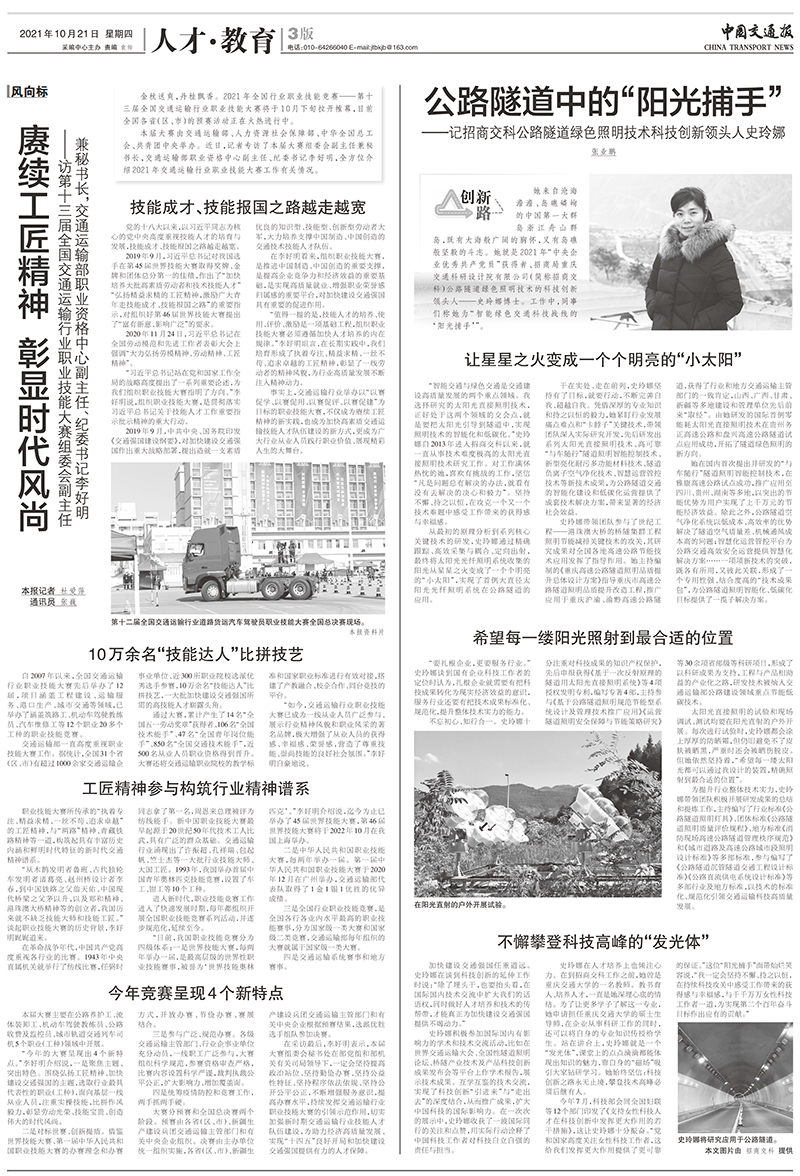 《中國交通報》刊文報道“中央企業(yè)優(yōu)秀共產(chǎn)黨員”史玲娜先進事跡 【編者按】史玲娜,現(xiàn)任招商交科交通與節(jié)能工程院副院長,自2013年進入公司以來,就長期致力于太陽光光纖照明技術(shù)方面的研究工作,