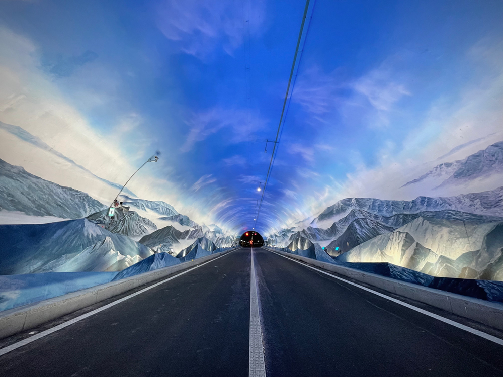 本次通車段共包含5個隧道,隧道洞門及洞內(nèi)景觀由景觀與建筑設(shè)計(jì)院設(shè)計(jì)并實(shí)施。城開特長隧道長達(dá)11.5公里,是重慶市目前最長的高速公路隧道,其中景觀拓寬段通過“聲”、“光”、“畫”的方式,打造出國內(nèi)首座純手繪“4D景觀”高速公路隧道。