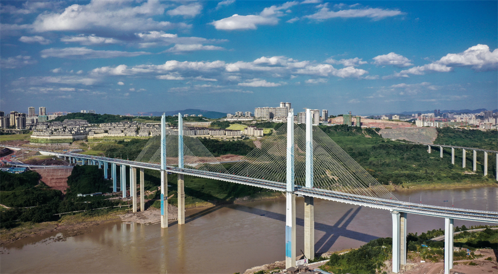 重慶市蔡家嘉陵江大橋主橋為(140+320+140)米等高雙塔雙索面斜拉橋,采用全過程景觀設(shè)計,主題突出,與重慶兩江四岸風貌融合。主梁寬度達37.5米,為重慶市范圍內(nèi)最寬PC梁斜拉橋,設(shè)計采用了“雙邊箱+加勁肋”的斷面形式和超寬PC梁設(shè)計施工關(guān)鍵技術(shù)。首次在大跨徑超寬主梁斜拉橋的無上橫梁塔柱中采用豎向預(yù)應(yīng)力,解決了主梁曲線布置下簡約橋塔不利受力的關(guān)鍵技術(shù)問題。