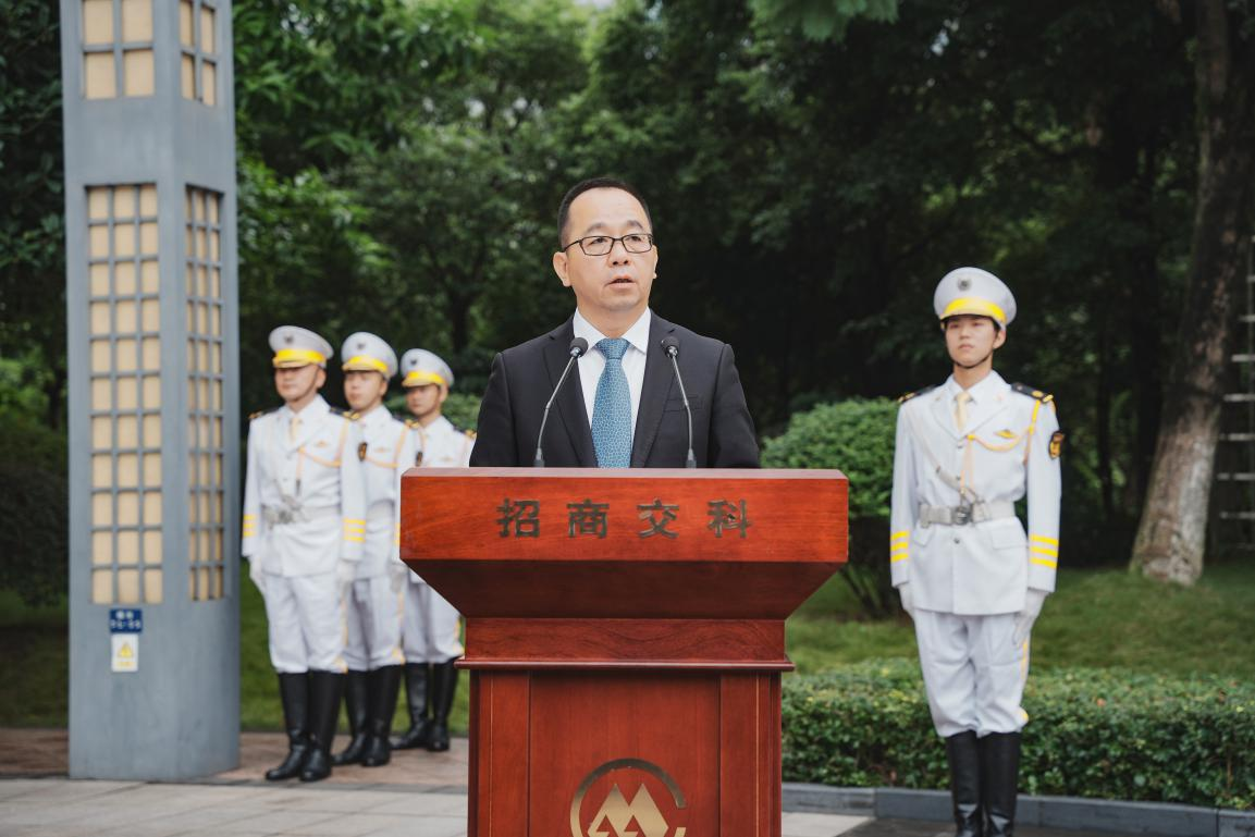 升旗儀式上,身著白色制服的儀仗隊(duì)員護(hù)著國(guó)旗、招商局旗,邁著整齊的步伐走向升旗臺(tái)。在《國(guó)歌》和《招商局之歌》的莊嚴(yán)歌聲中,五星紅旗和招商局旗先后冉冉升起,迎風(fēng)飛揚(yáng)。