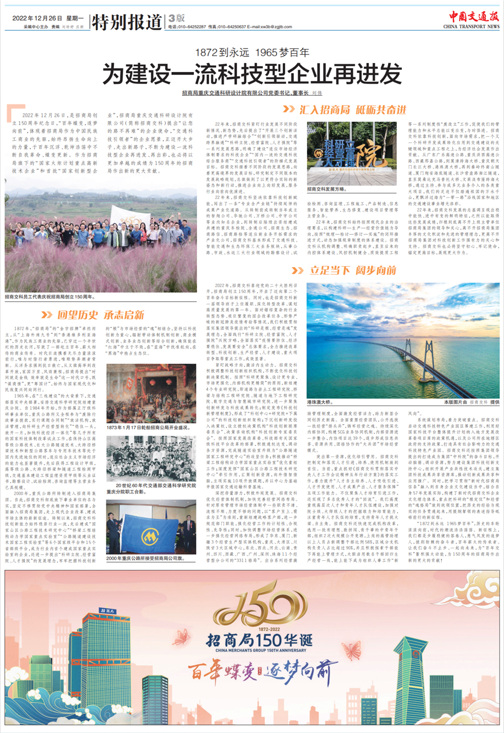 2022年12月26日,是招商局創(chuàng)立150周年紀(jì)念日,《中國交通報(bào)》在第三版整版刊發(fā)了招商交科黨委書記、董事長劉偉署名文章,表達(dá)了招商交科全體干部員工對(duì)招商局集團(tuán)的祝福和感激。自2000年轉(zhuǎn)制進(jìn)入招商局集團(tuán)22年來,在招商局集團(tuán)的正確領(lǐng)導(dǎo)下,招商交科建設(shè)科技型企業(yè)信心更堅(jiān)定,道路更寬闊,成果更豐碩。面向未來,招商交科深入學(xué)習(xí)貫徹黨的二十大精神,按照招商局集團(tuán)的戰(zhàn)略規(guī)劃,向著一流勇毅前行!現(xiàn)將全文轉(zhuǎn)載如下: