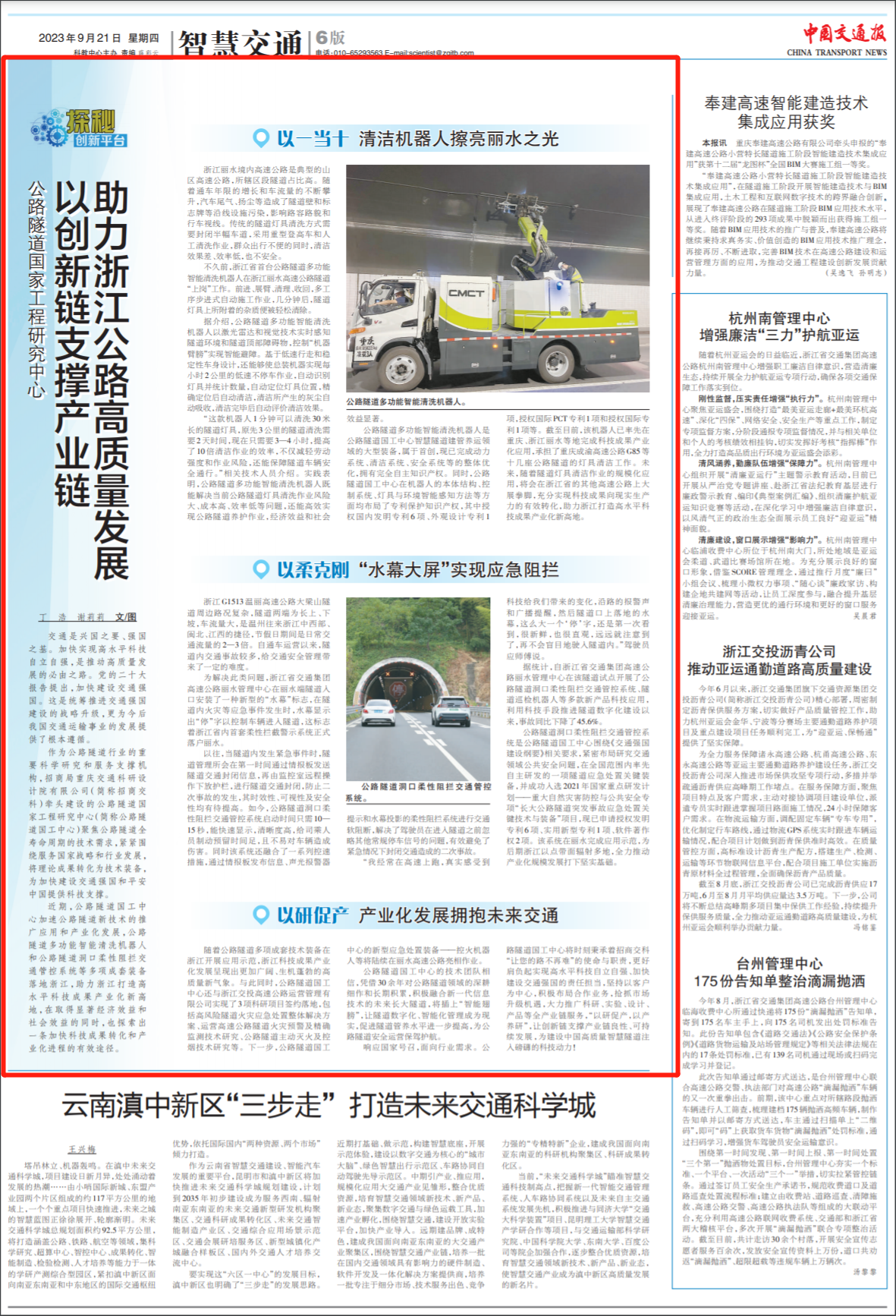 2023年9月21日,《中國交通報》在第6版以《創(chuàng)新鏈支撐產(chǎn)業(yè)鏈發(fā)展 公路隧道國家工程研究中心助力浙江打造高水平科技成果產(chǎn)業(yè)孵化新高地》為題,刊發(fā)了招商交科公路隧道國家工程研究中心有關(guān)報道。報道聚焦長大公路隧道成套技術(shù)裝備的示范應(yīng)用,介紹招商交科“公路隧道多功能智能清洗機器人”“公路隧道洞口柔性阻攔交通管控系統(tǒng)”等裝備落地浙江,并與浙江地方企業(yè)展開科研項目合作,助力浙江打造高水平科技成果產(chǎn)業(yè)化新高地,加速我國公路隧道新技術(shù)的推廣應(yīng)用和產(chǎn)業(yè)化發(fā)展的具體情況?,F(xiàn)將全文轉(zhuǎn)載如下: