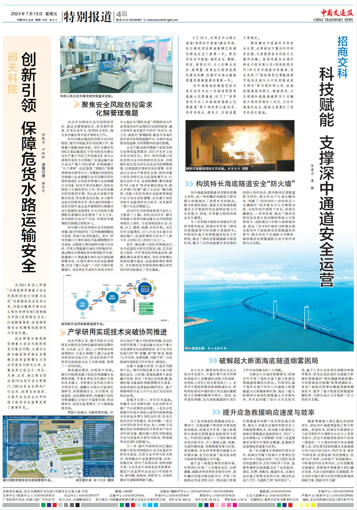 7月19日,《中國交通報》在第四版“特別報道”刊發(fā)了《招商交科:科技賦能 支撐深中通道安全運營》文章,介紹了招商交科作為深中通道的參建單位之一,在海底隧道結(jié)構(gòu)耐火、隧道通風(fēng)、火災(zāi)排煙和疏散救援等技術(shù)攻關(guān)方面作出的貢獻?,F(xiàn)將全文轉(zhuǎn)載如下: