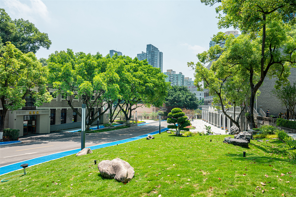 建筑立面上營造青磚灰墻呼應(yīng)上世紀(jì)七十年代的歷史氛圍,拱券長廊營造時(shí)光長廊氛圍感,增加了建筑樓名牌設(shè)計(jì)點(diǎn)睛,彰顯文化的厚重與底蘊(yùn);海棠秋池廣場在保留原有水池條石的基礎(chǔ)上,在鋪裝上補(bǔ)充了園內(nèi)老條石,映襯出歷史的斑駁,延續(xù)園區(qū)的年代感。