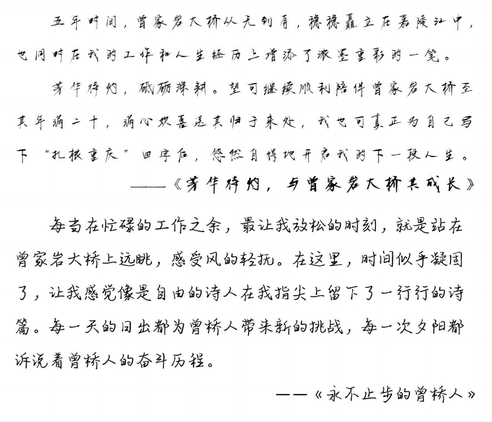 《芳華待灼,與曾家?guī)r大橋共成長(zhǎng)》仿佛看到了作者與曾家?guī)r大橋一同砥礪深耕,“扎根重慶”時(shí)流下的汗水。《大愛無疆曾橋人 科技賦能優(yōu)服務(wù)》描繪了曾橋人如何用自己的智慧賦予了大橋生命。《永不止步的曾橋人》用不同的視角展現(xiàn)出了大橋建設(shè)過程中的艱辛……員工們通過一個(gè)個(gè)微小平凡的故事,表達(dá)了與曾家?guī)r大橋的共情共鳴,也讓大家感受到一座蓬勃向上、鮮活而生動(dòng)的曾家?guī)r大橋。