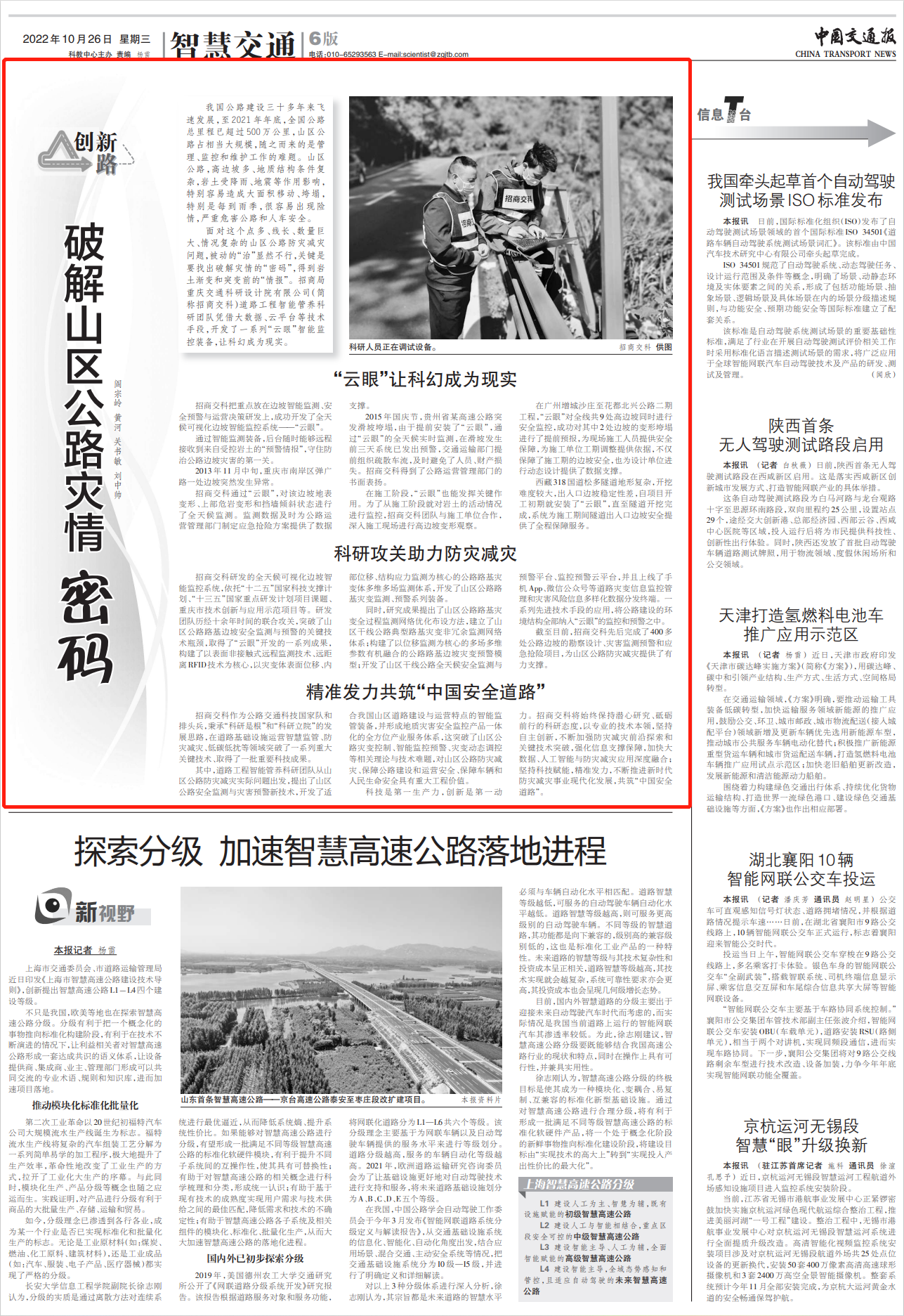 10月26日,《中國交通報》在第6版全文刊發(fā)道路研究院文章《破解山區(qū)公路災情“密碼”》,文章介紹了招商交科始終立足專業(yè),堅持自主創(chuàng)新,加強防災減災前沿技術(shù)探索,強化信息支撐保障,加快大數(shù)據(jù)、人工智能與防災減災應用深度融合;堅持科技賦能,精準發(fā)力,不斷推進新時代防災減災事業(yè)現(xiàn)代化發(fā)展,共同助力“中國安全道路”?,F(xiàn)將全文轉(zhuǎn)載如下: